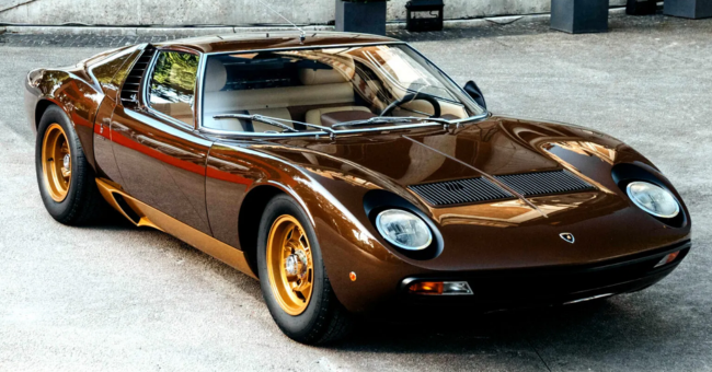 Brown is rarely associated with supercars, but on the Miura, it works perfectly. The curves, proportions, and design lines are enhanced rather than muted.